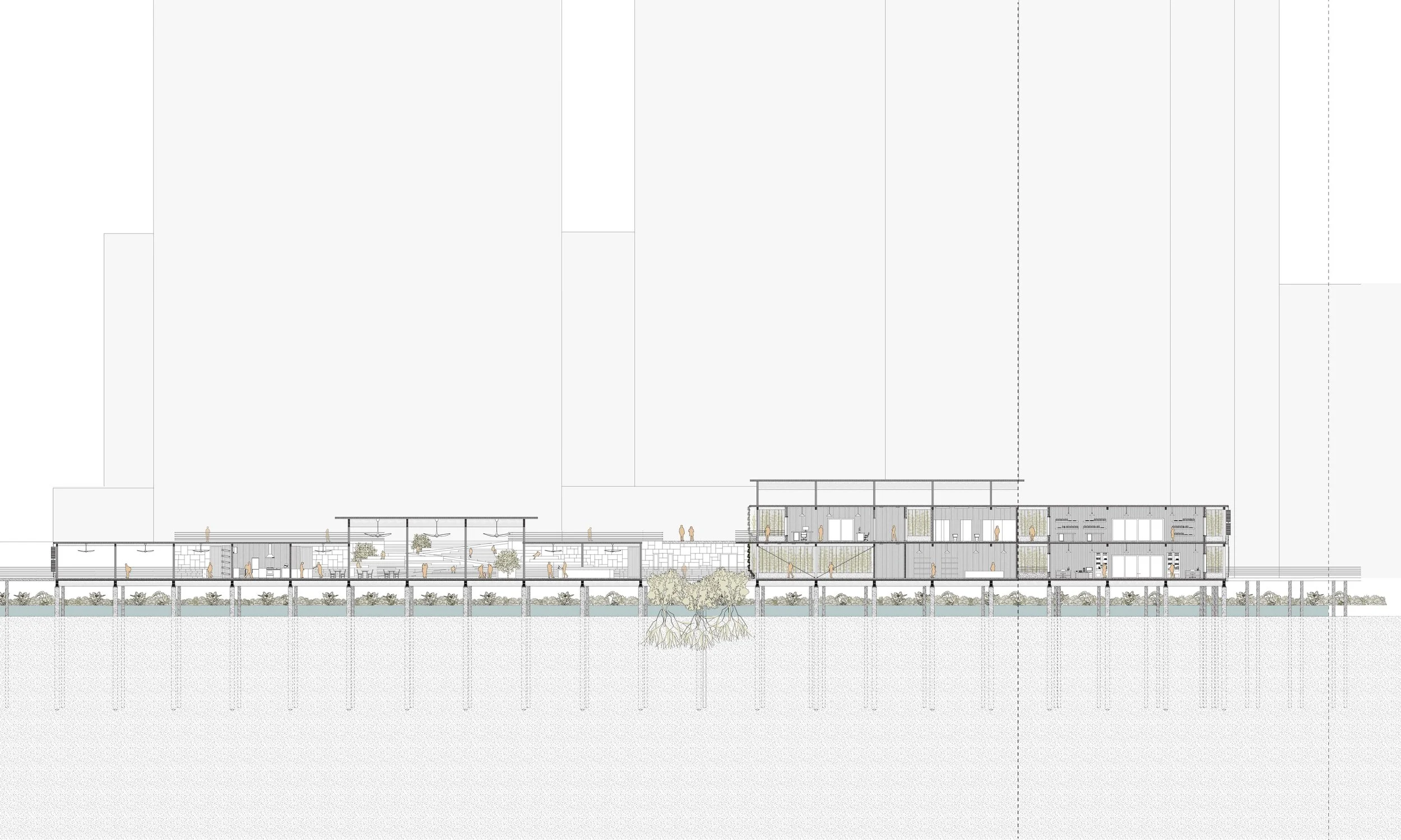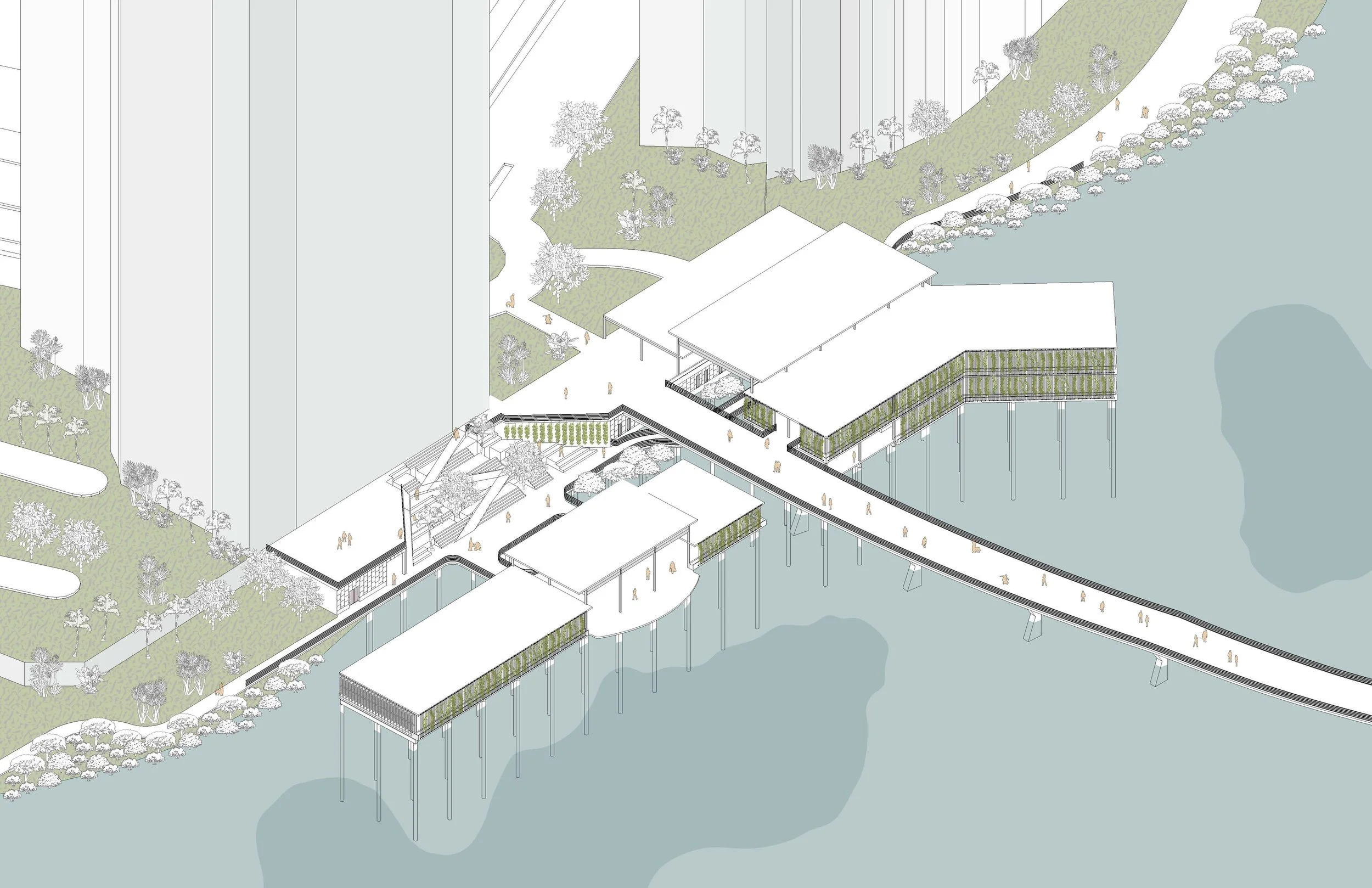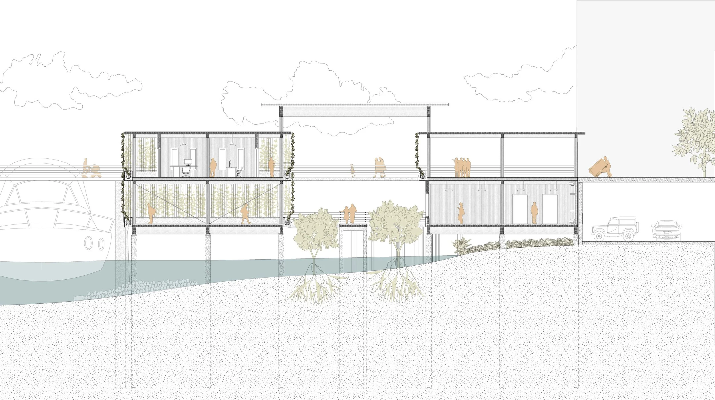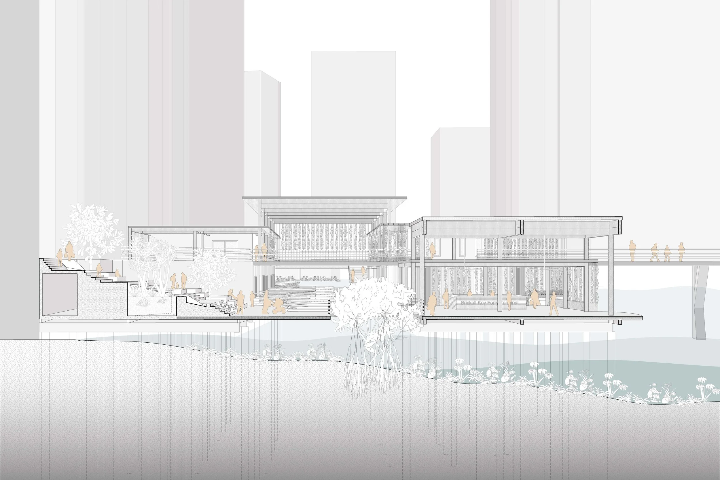 The Brickell Key Disaster Outpost Center and Ferry Terminal break the intrusive barriers that disconnect the land from the sea, by replacing the existing hard edges and replacing them with softer and looser conditions that accept and evolve with the dynamic environmental forces at the site. The elevated building complex prepares for the rising sea and monumental king tides while reducing its footprint in the landscape. The outpost center and ferry terminal facilitate movement and provide equitable access to disaster relief resources while providing a haven for those affected by catastrophes.