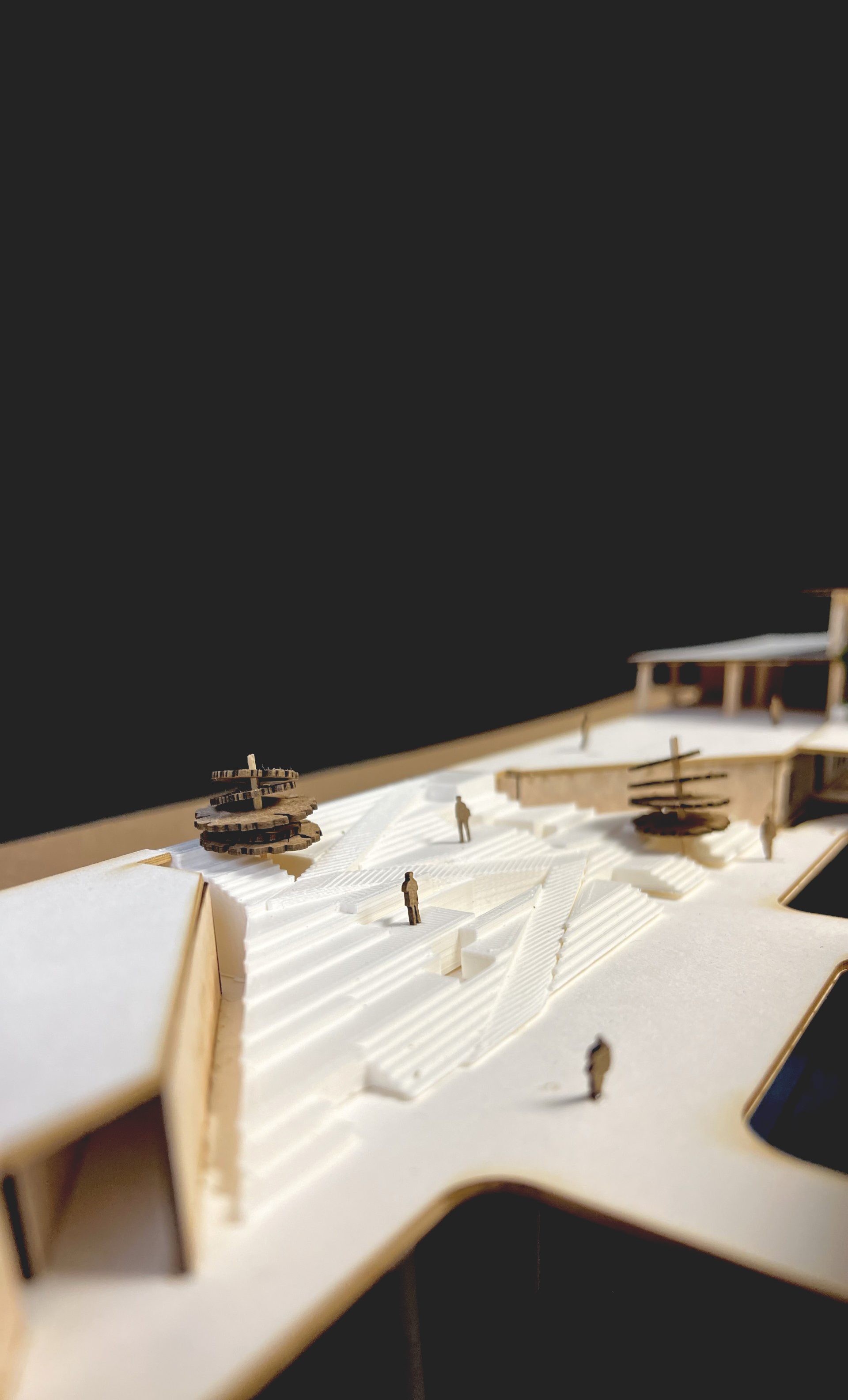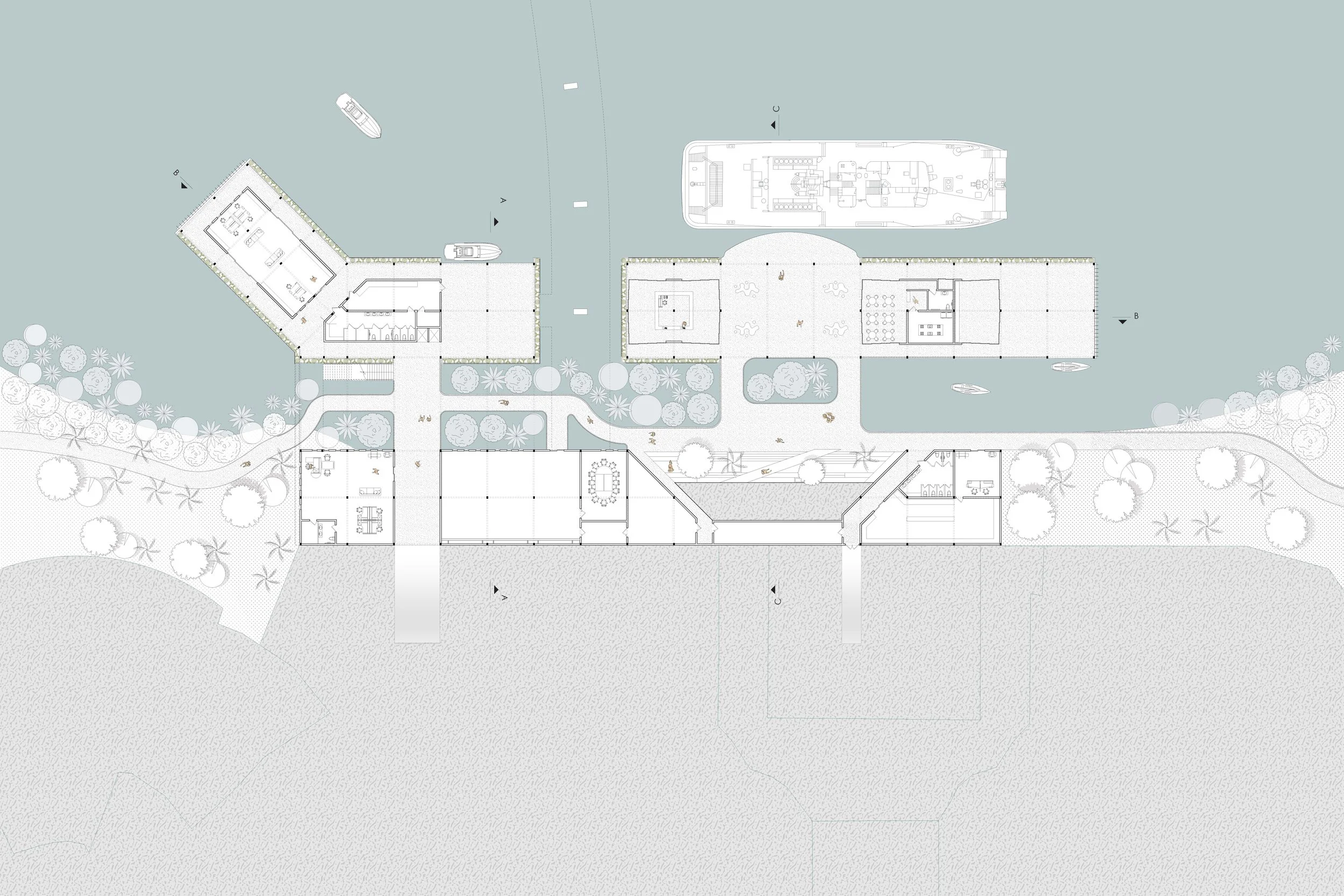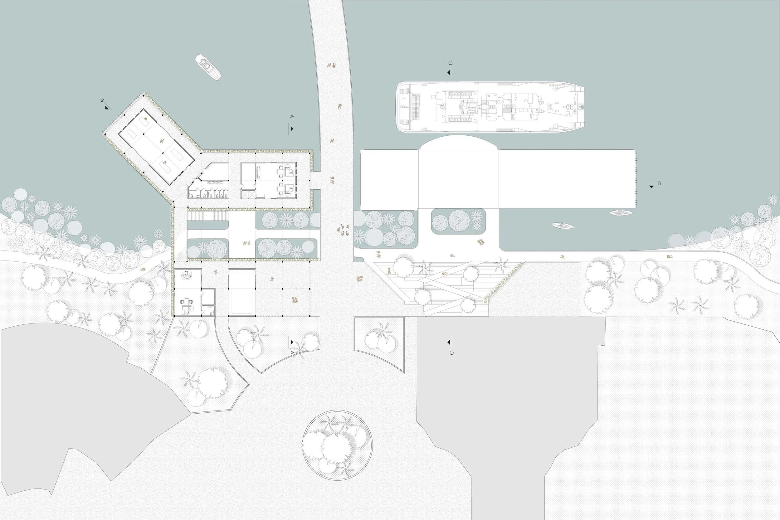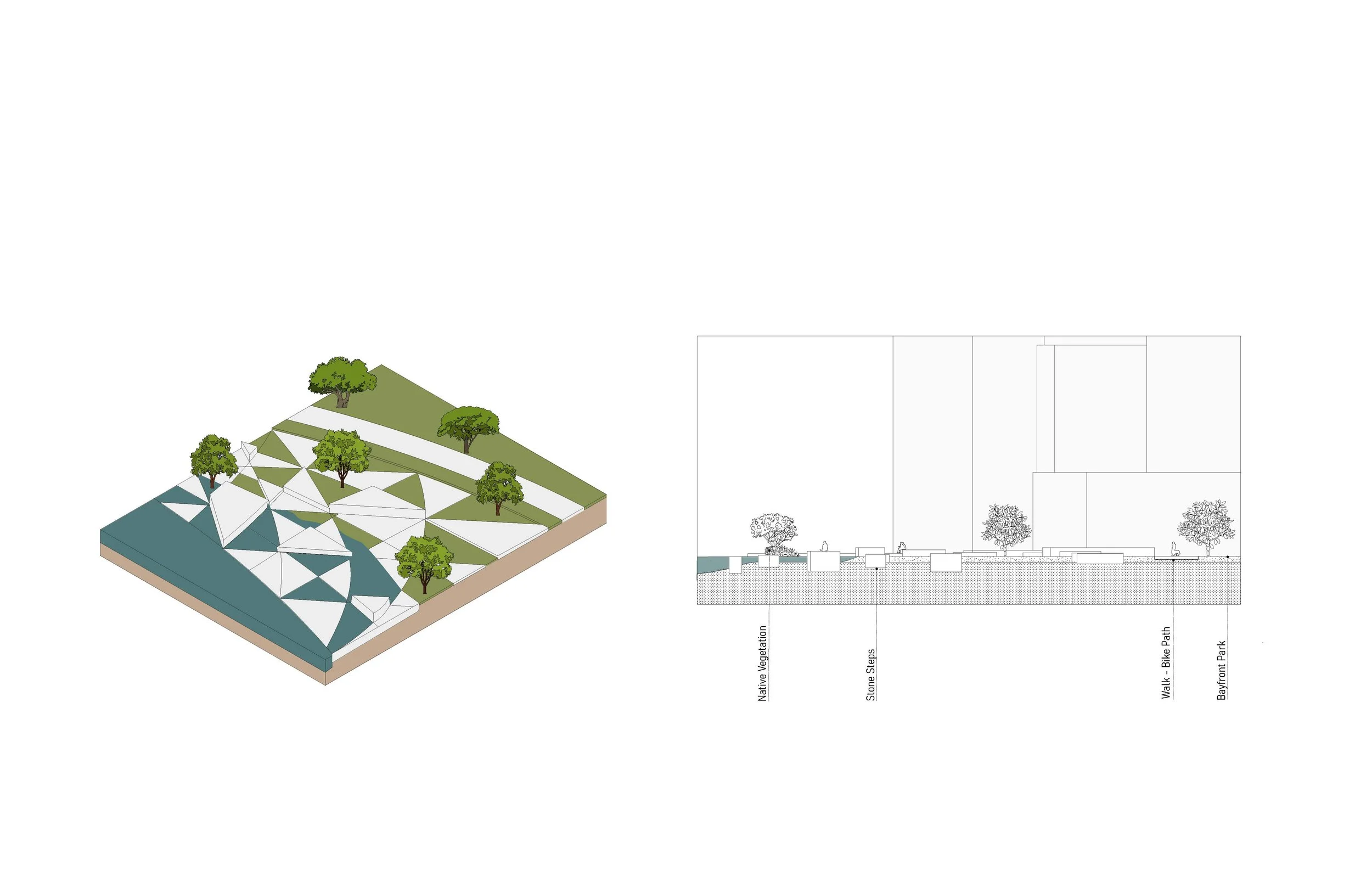 The Brickell Key Disaster Outpost Center and Ferry Terminal break the intrusive barriers that disconnect the land from the sea, by replacing the existing hard edges and replacing them with softer and looser conditions that accept and evolve with the dynamic environmental forces at the site. The elevated building complex prepares for the rising sea and monumental king tides while reducing its footprint in the landscape. The outpost center and ferry terminal facilitate movement and provide equitable access to disaster relief resources while providing a haven for those affected by catastrophes.