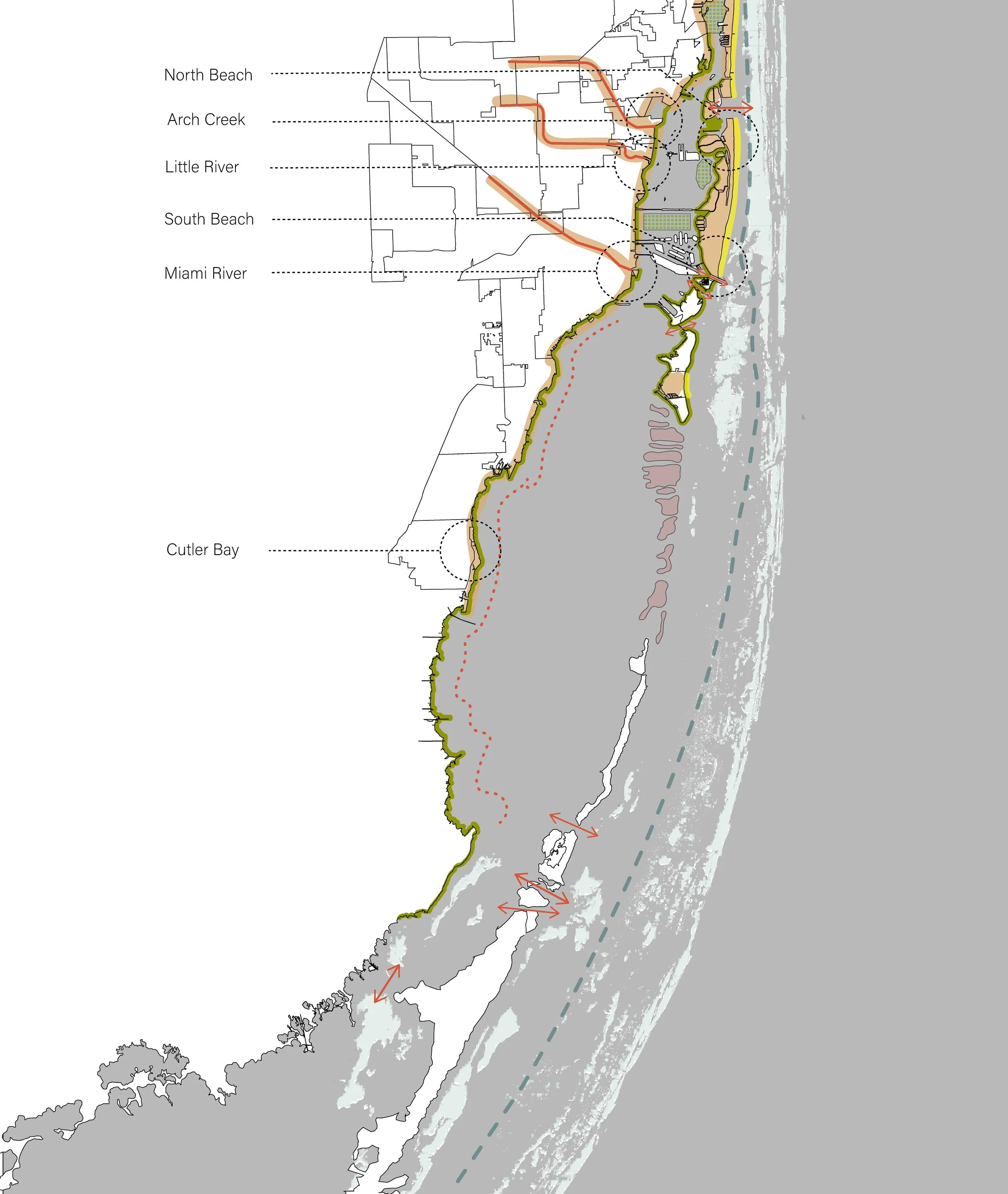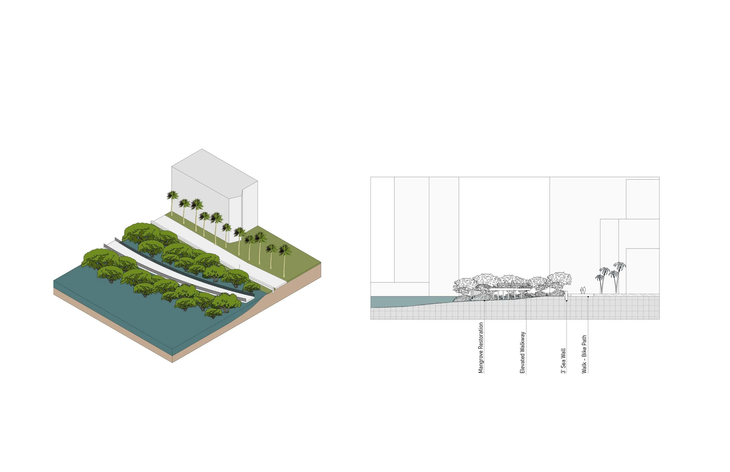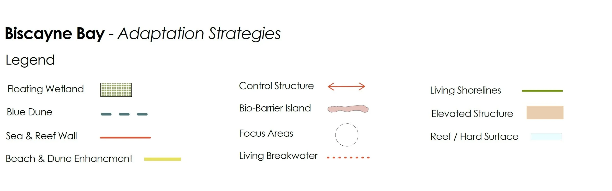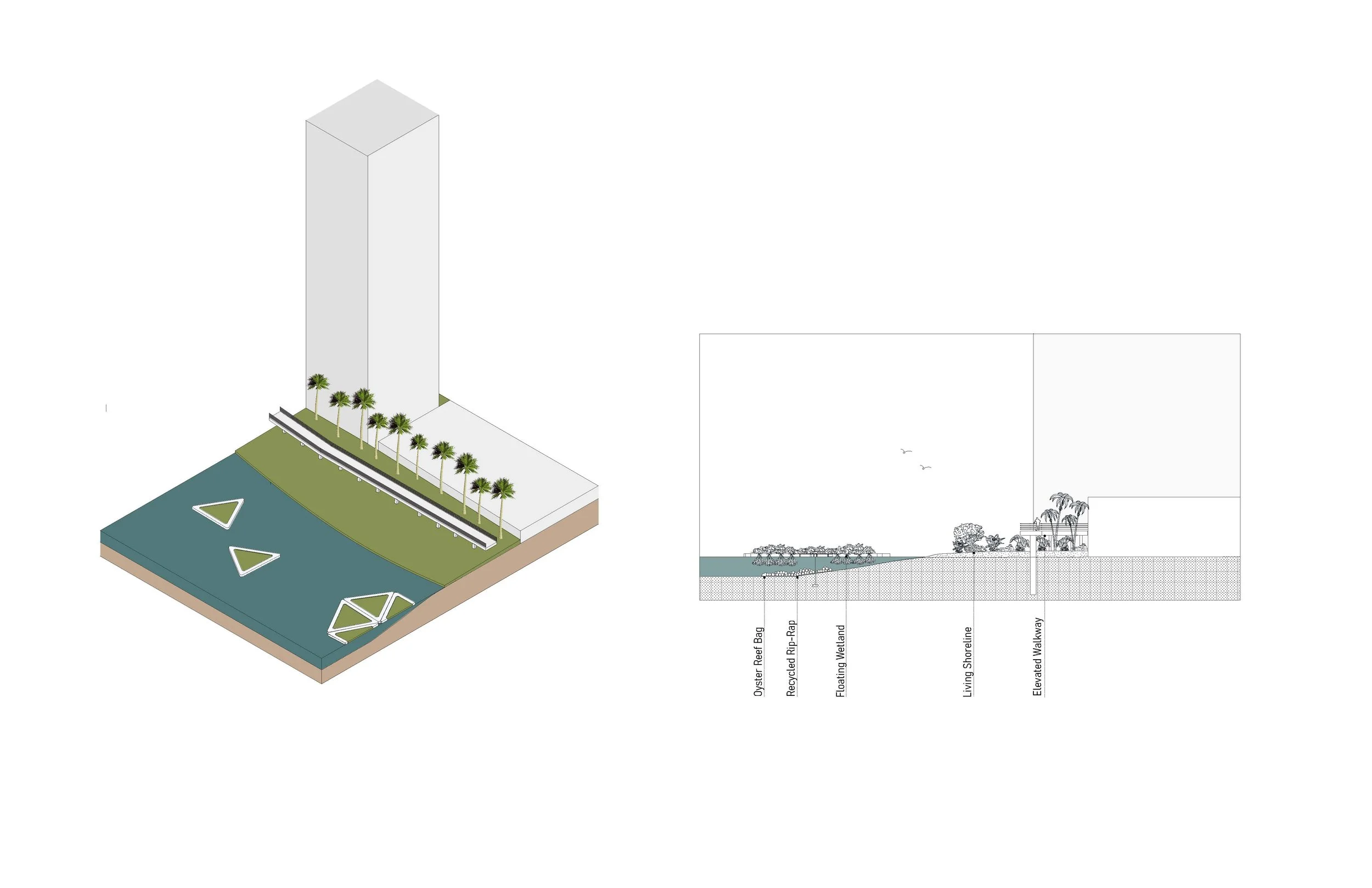 The research for the Brickell Key Disaster Center and Ferry Terminal expanded upon the USACE’s study site to develop a more holistic approach to climate risks using nature-based solutions in conjunction with hard adaptation measures. This approach considers the comprehensive set of benefits provided by each line of endurance, including recreation, bioremediation, habitat enhancement, community resilience, and accessibility.